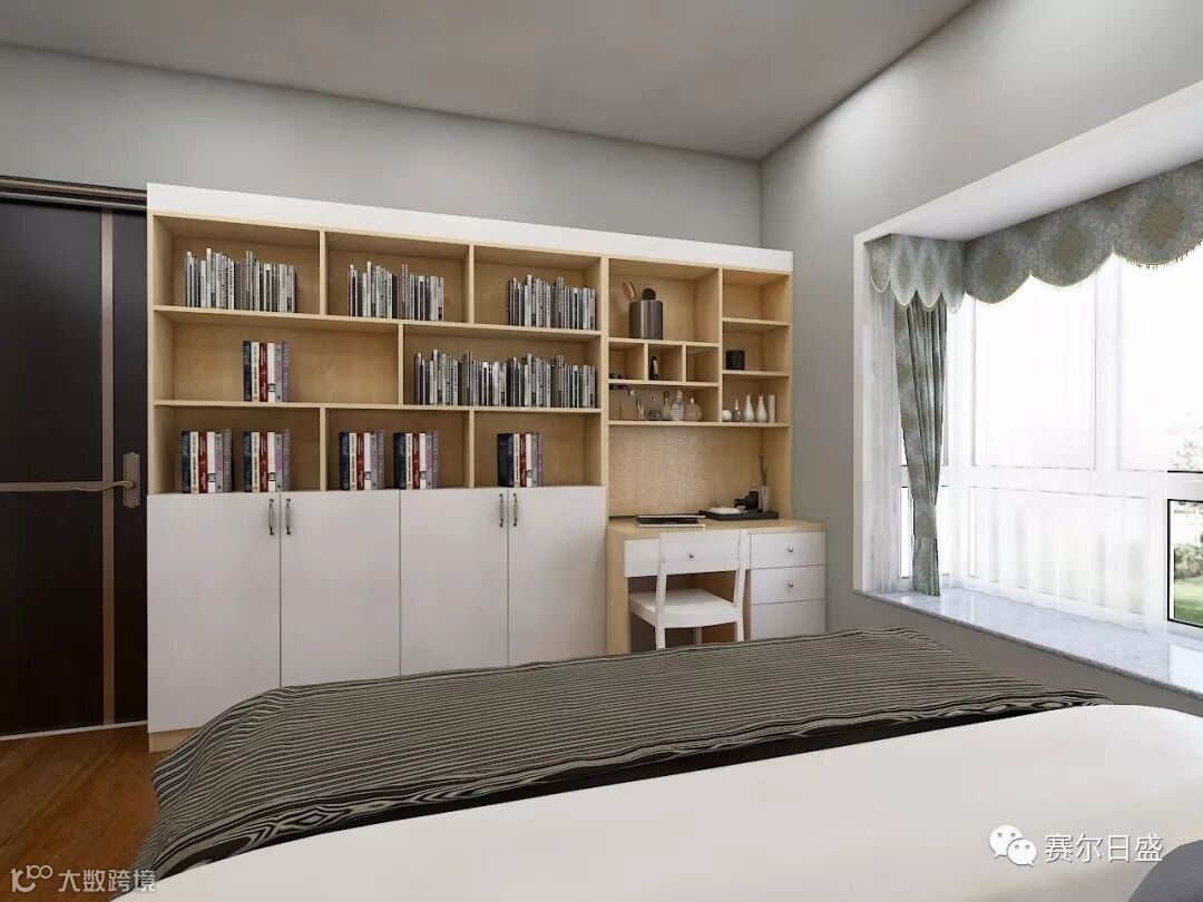 书桌书柜一体的组合设计,一眼看去有不少的书格,便于分门别类摆放书籍。简约的连体书柜书桌组合,带给人落落大方、干净利落的感觉。满足日常办公、学习所需,给卧室腾出更多的活动空间。