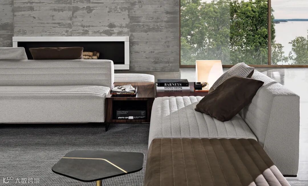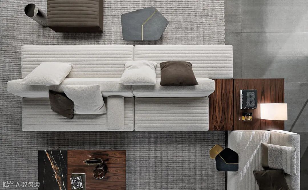 Roger 标志性的特色在雕刻版的型制,皮革与织物的线性剪裁绗缝,取自绵长水流的灵感,表达了高级定制工艺的时尚使命。可以自由设计高低的靠背、不同类型的扶手加上Case咖啡桌或者收纳组件,亦能成为别样景致。