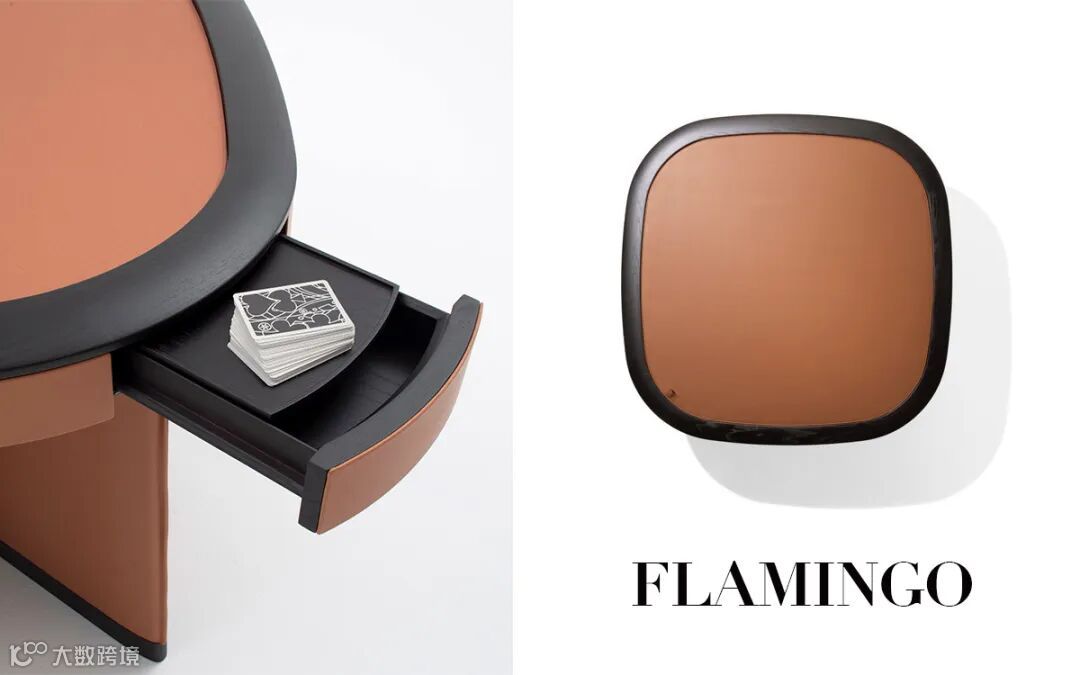 Flamingo 餐桌则是率性而为的新设计,呈现了一种生活的乐趣与欢愉的分享,设计的灵感来源于扑克牌桌,享受美食之外亦可作为棋牌娱乐之用,精巧设计的四面抽屉可以陈放一些小物件或者餐具,桌延的斜面设计足够让手臂得到舒适放松。Annette 扶手椅以一位著名扑克牌明星的名字命名,水流线条的靠背设计与坐垫部分用复杂的金属结构拼合而成,美观且极其舒适。