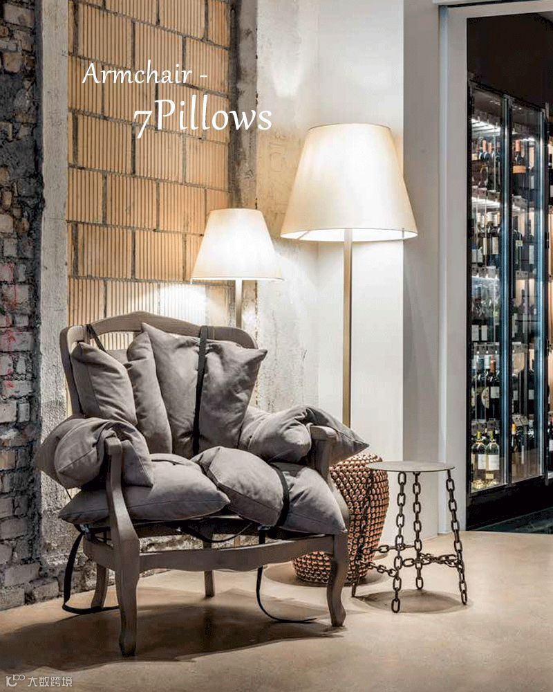 由7个羽绒抱枕和实木框架组成的艺术单品,突出了在完全开放的结构中可以看到的舒适感,并传达了制作填充的简单性。背带固定的软垫与木制框架完全是手工制作,舒适与温馨之感弥漫整个空间。