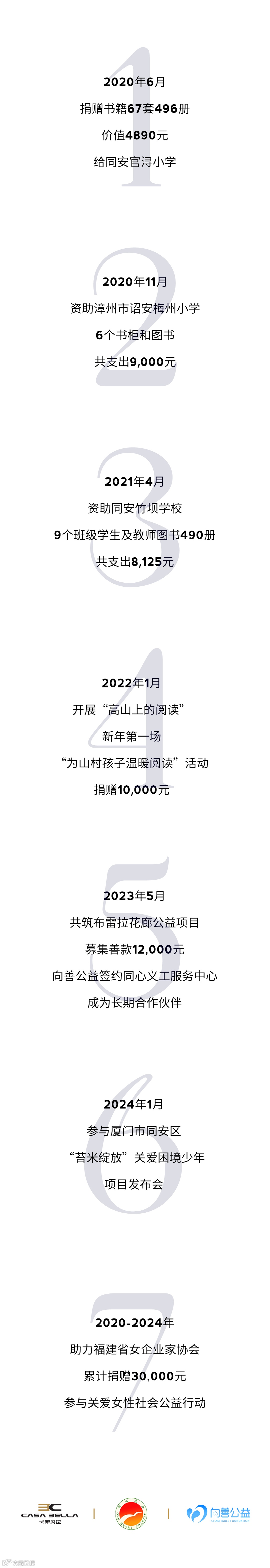 卡萨贝拉董事长贺晓红作为福建省女企业家协会副会长,已经连续四年积极参并投入到助力女性公益活动中。「 为家美好 」在传递美好生活的路上,卡萨贝拉除了做好品牌和服务之外,更希望通过企业和团队的点滴爱心,号召更多人参与到公益行动上来,让更多需要关爱的家庭感受到社会的温暖。