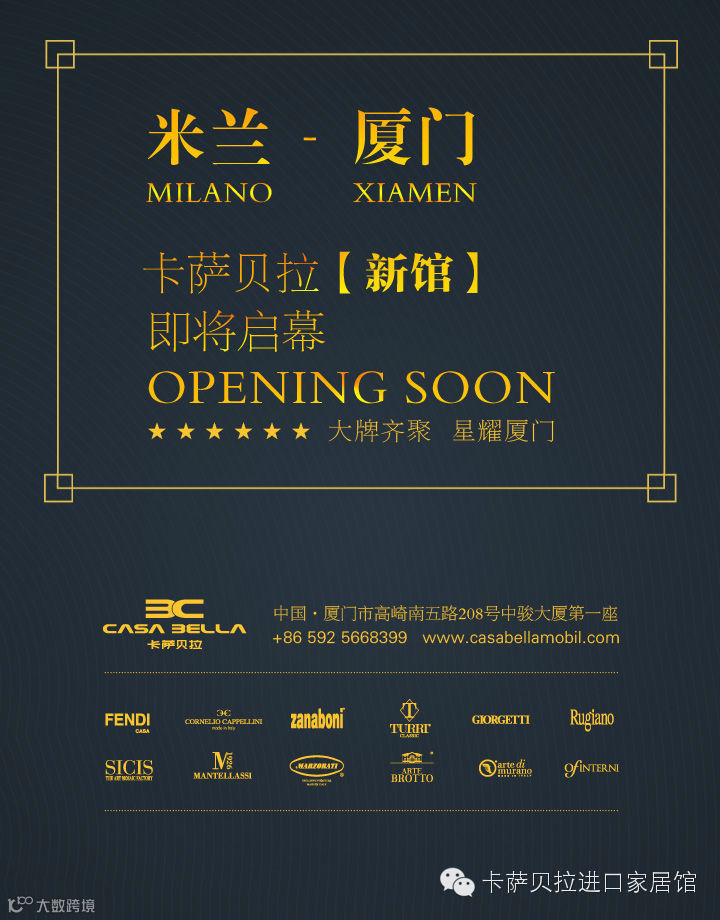 从米兰到厦门,卡萨贝拉联袂FENDI CASA、CORNELIO CAPPELLINI、ZANABONI、GIORGETTI、TURRI、RUGIANO、SICIS、MARZORATI、ARTE DI MURANO,大牌齐聚,星耀厦门。全新奢尚新馆即将华丽启幕:重金打造的极致精品店,星光璀璨的国际大牌,尊崇至尚的服务体验……