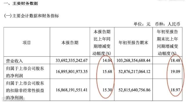 但第三季度单季中,贵州茅台业绩增速较今年上半年明显放缓,当季实现营业收入为336.92亿元,同比增长14.04%;实现净利润168.96亿元,同比增长15.68%。反观今年上半年,贵州茅台营业收入和净利润分别为695.76亿元和359.8亿元,同比增长幅度均为20.76%。