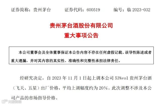 主要消息:“10月31日晚间,贵州茅台酒股份有限公司发布公告称,经研究决定,自2023年11月1日起上调本公司53%vol贵州茅台酒(飞天、五星)出厂价格,平均上调幅度约为20%。此次调整不涉及本公司产品的市场指导价格。”