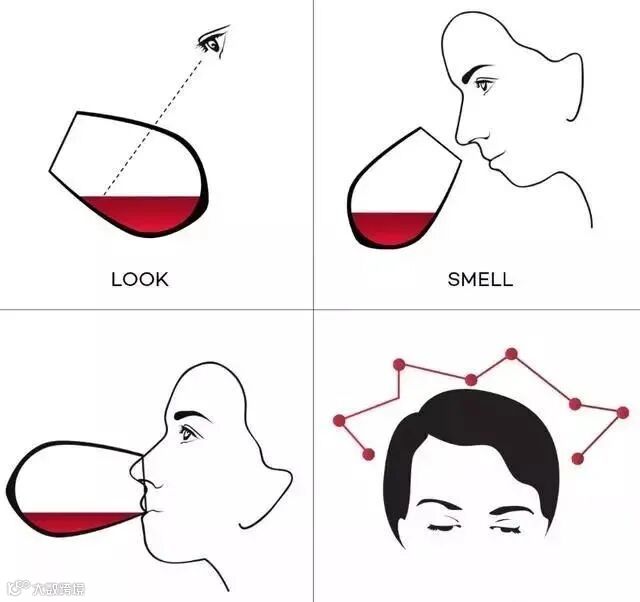 闻酒的味道,将杯口整个罩住鼻孔深呼吸,越好的红酒闻起来味道越厚越复杂,由于鼻子的灵敏度远远超过舌头,因此有时候一杯红酒慢慢品味了一个小时,还是感觉香味越来越浓,浓到后来让人舍不得喝。
