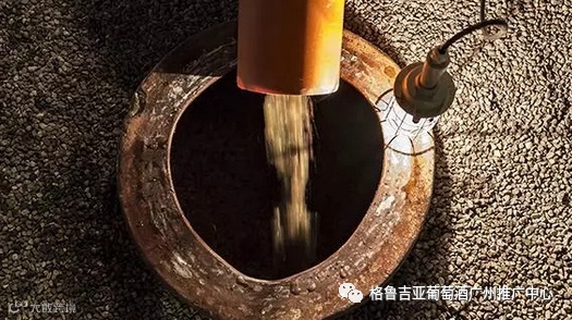 传统的格鲁吉亚酿酒法,葡萄压榨是在整棵树掏成的巨大木槽中以人脚踩踏完成,踩踏出的汁和破碎的皮渣从木槽底部流出,由另外的木槽直接导流到埋入地下的陶罐中。因为无论冬夏,埋在地下的陶罐一般是14℃~16℃,葡萄汁流进陶罐后自然发酵,通常白葡萄发酵需要一两周的时间,红葡萄则需要两周到两个月。