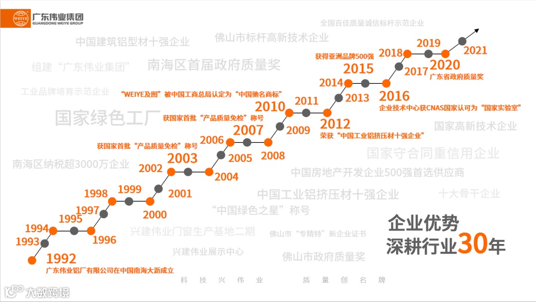 作为一家本土铝型材企业,伟业集团旗下三大品牌伟业铝材、伟业门窗、伟业铝家居打响伟业进万家的口号。从1992年开始,踏踏实实以铝型材筑造美好社会;兢兢业业做好企业,为社会创造财富;提供3000+就业岗位,解决更多就业问题;尽伟业之所能帮助企业困难员工和支持慈善基金;“诚”风破浪,恪守诚信,上缴更多税收,成就更大的民生工程。