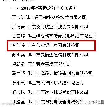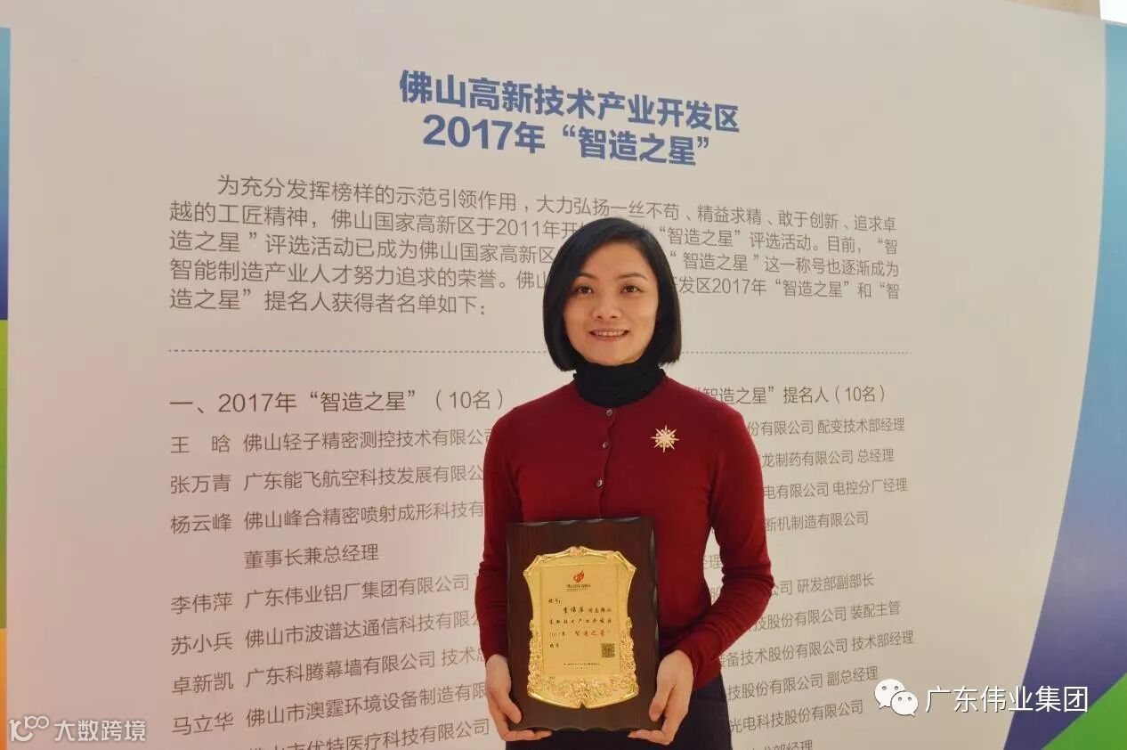 自今年9月份以来组织开展佛山高新技术产业开发区2017年“智造之星”评选工作。经过企业推荐、专家评审、网络投票等环节,广东伟业集团副总经理李伟萍女士作为铝制造行业、企业高管代表在评选中脱颖而出,获佛山高新技术产业开发区2017年“智造之星”表彰。
