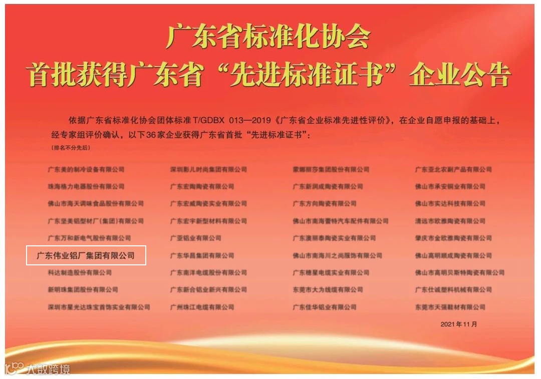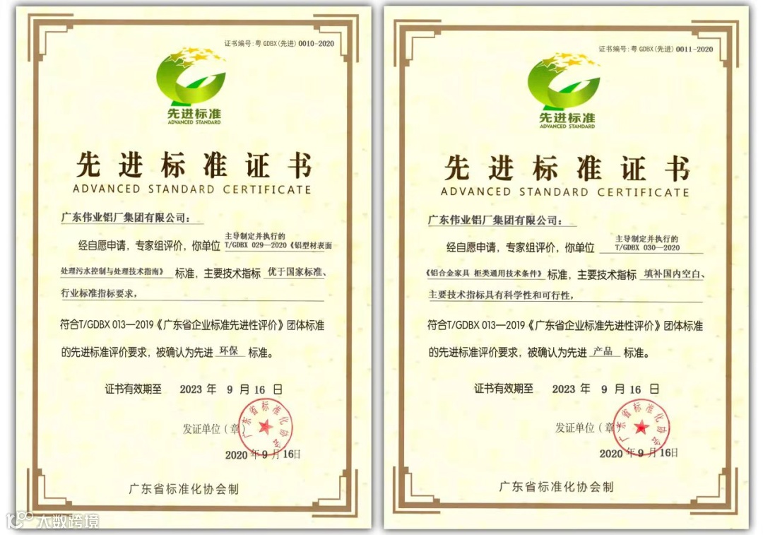 去年,伟业集团主导的《铝型材表面处理污水控制与处理技术指南》、《铝合金家居 柜类通用技术条件》标准,通过广东省标准化协会专家组认定,首批获得先进标准。而本次进一步获得广东省首批先进标准证书企业,更是对伟业集团标准化体系建设工作的肯定。