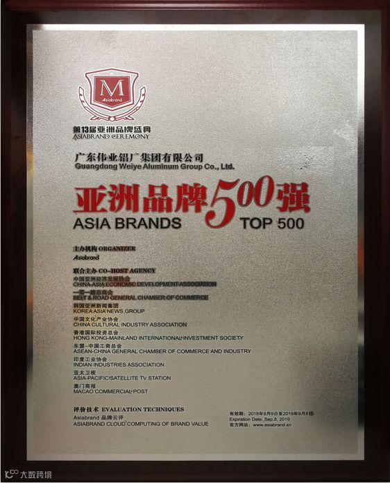 产品品质优良、品牌积淀深厚以及在铝型材行业的领导地位,是广东伟业集团此次入选“亚洲品牌500强”的重要原因。近年来,伟业积极推进品牌建设,此前已数次入选“中国最具价值品牌”排行榜,本次由亚洲品牌测评体系评估,所属亚洲品牌500强第301名。