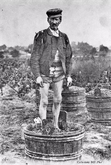 这张100多年前的老照片,记录的是法国卢瓦尔河谷Sologne地区在葡萄采收时,酒农踩葡萄压汁的情景。