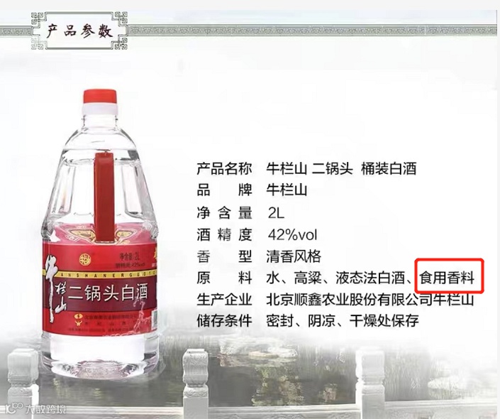 “牛栏山陈酿”、“珍品陈酿”、“新一代陈酿”等产品的配料表上明确标有“食用香料”按照新标准,这些“白酒”将被划为“调香白酒”不得再称为白酒