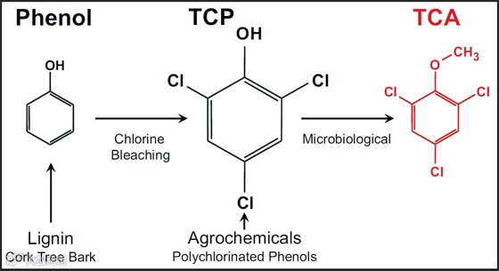 TCA 和 TBA 都不是自然条件下产生的,而TCA 其实是装瓶前产生的!有时 TCA 会渗透进酿酒设备(橡木桶、管道、软管或者运货的托盘)从而污染一大批酒,这样即使是螺旋盖的葡萄酒也会有软木塞污染一般来说,当木塞中寄居的真菌接触到酒庄不卫生的环境或消毒残留物中的氯化物时,TCA 就形成了。因此如果酒庄使用带有 TCA 的软木塞,那么酒液也会相应受到一定程度的污染。