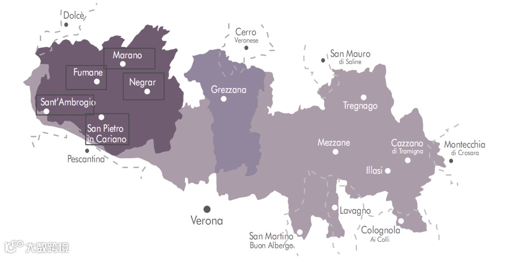 经典瓦波利切拉 – “Classico”是指 19 个乡村中的 5 个——分别是 Fumane、Marano、Negrar、Cariano 的 San Pietro 和 Sant'Ambrogio。以后如果酒标上看到Valpolicella Classico的字样,那就说明酿造这瓶酒的葡萄来自于这五个村庄。