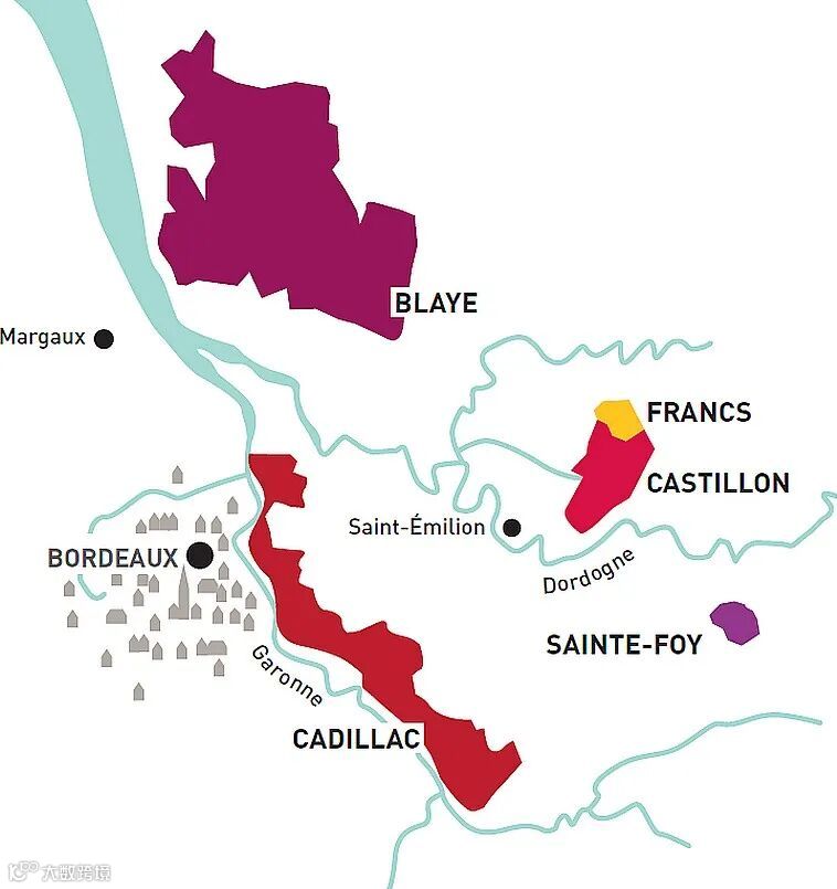 从2009年开始,波尔多的布拉伊Blaye、卡迪亚克Cadillac、卡斯蒂永Castillon、弗朗Francs和圣富瓦Sainte-Foy产区的酒农们决定实行改革,集合五大产区,成立“波尔多山丘法定葡萄酒产区”(AOC Ctes de Bordeaux)。
