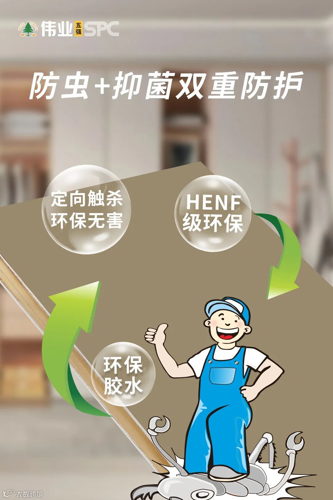这不是简单复合,而是功能共生。伟业五强板本身已具备净醛、防虫、阻燃、耐水、定型五大硬核实力,叠加SPC层后,实现六大性能全面跃升: