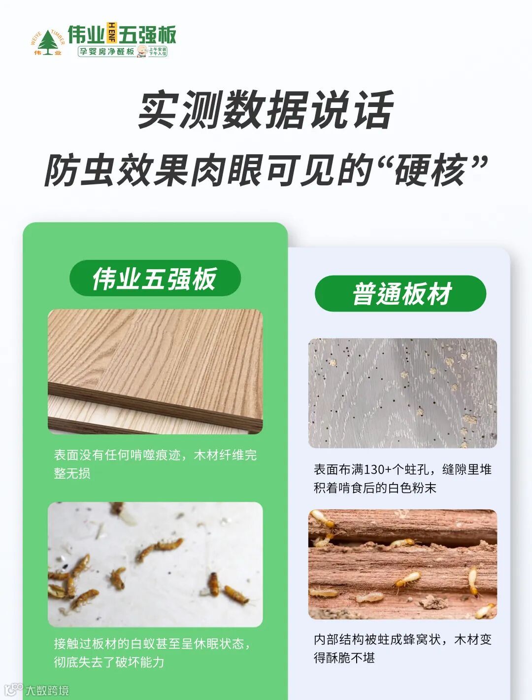 我们联合权威检测机构做了一场极限测试:把伟业五强板与普通板材同时放进“虫箱”,内置500只成年白蚁,72小时后结果一目了然: