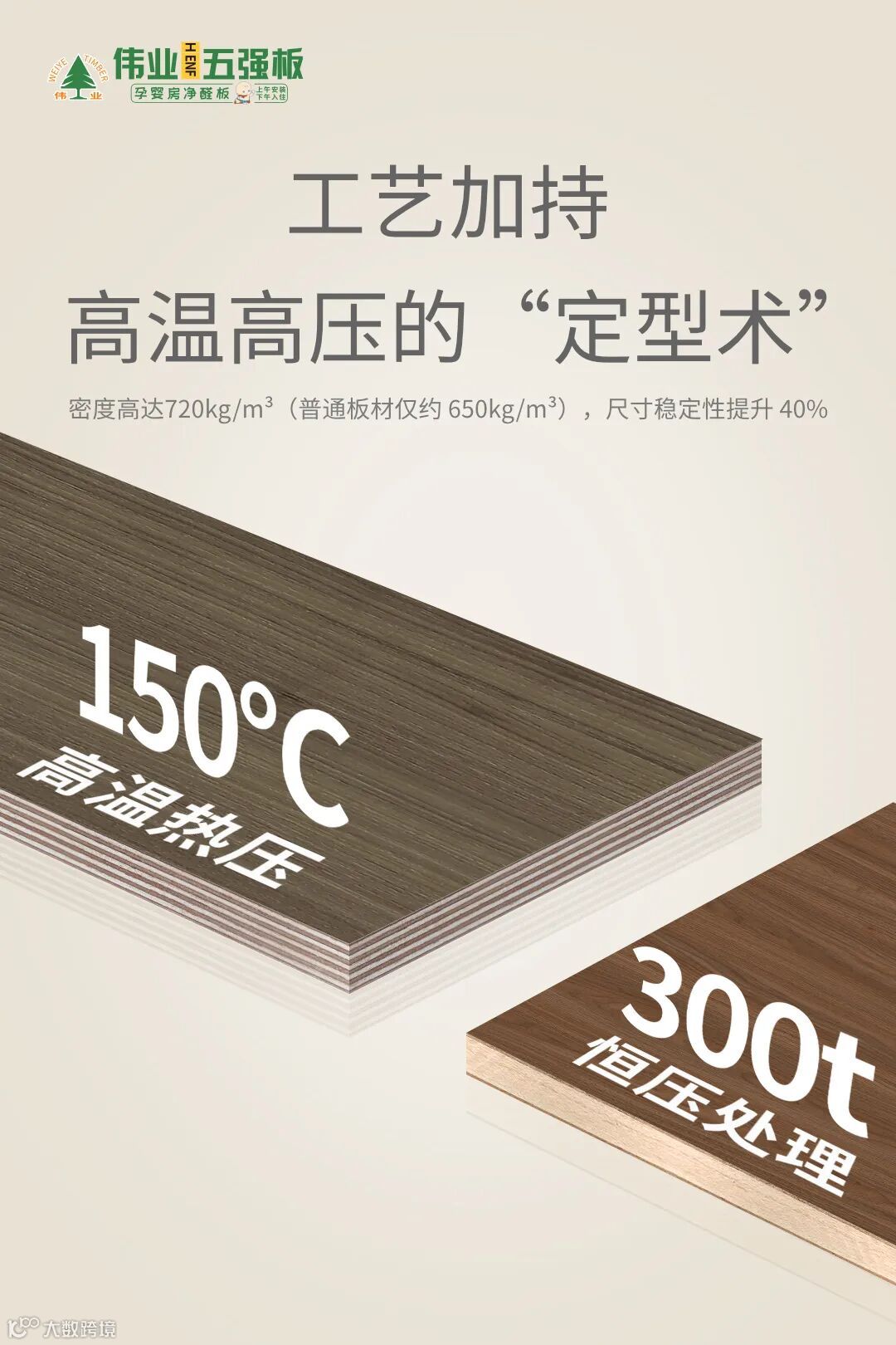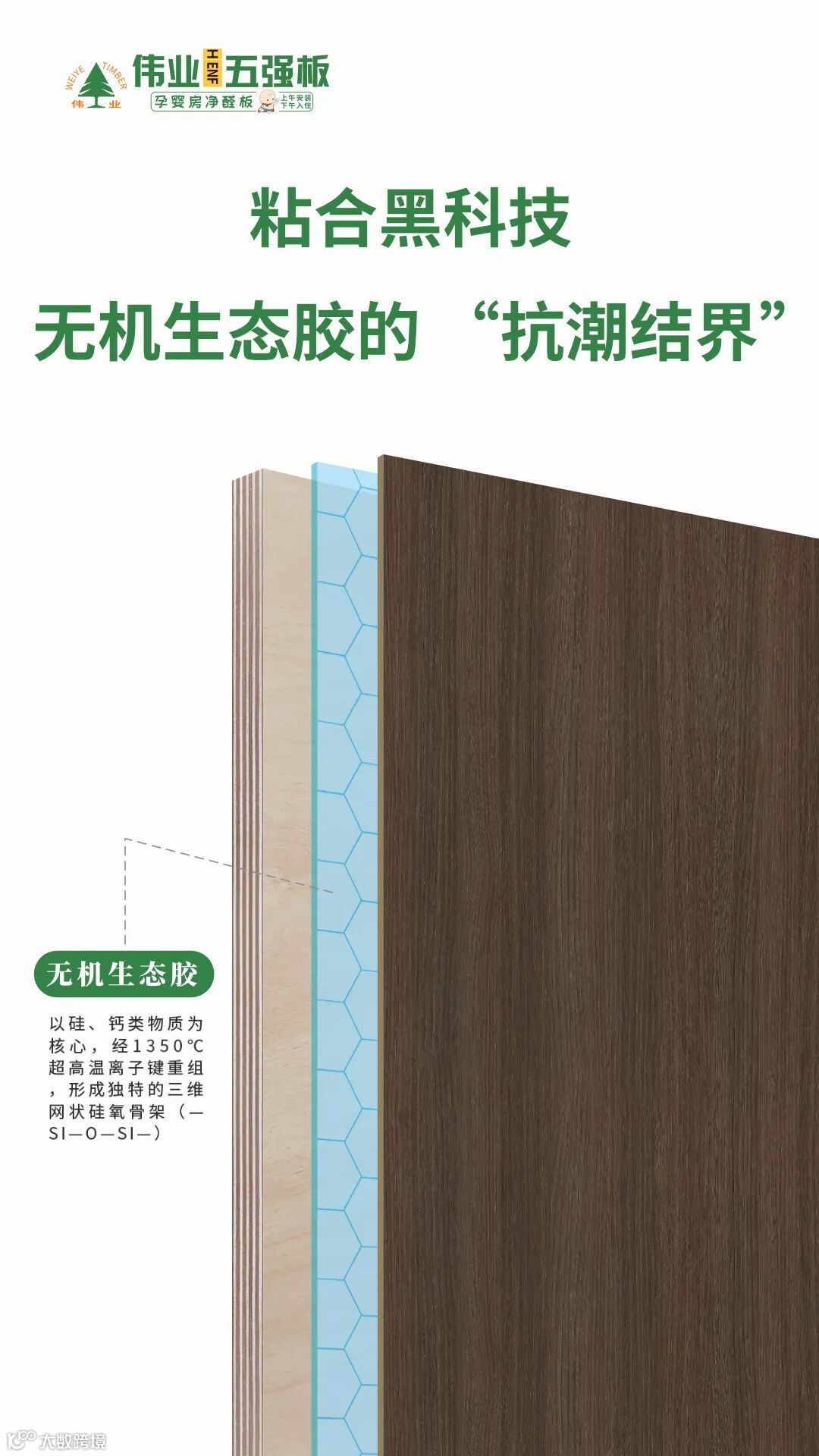 传统脲醛胶不仅含甲醛,遇水还会迅速失效。伟业五强板直接 “降维打击”,采用源自地壳矿物、经1350℃超高温煅烧的无机生态胶!