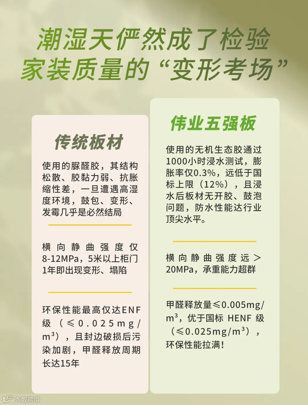 但在 “抗潮战场” 上,总有 “实力派选手”——伟业五强板,用硬核实力告诉你:拒绝“看天吃饭”,稳定才是家装底气!凭借五重防护体系,把“稳定”刻进了基因里: