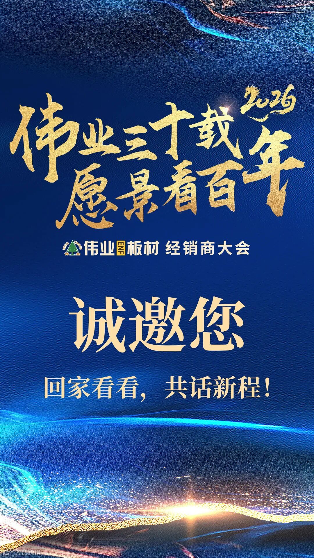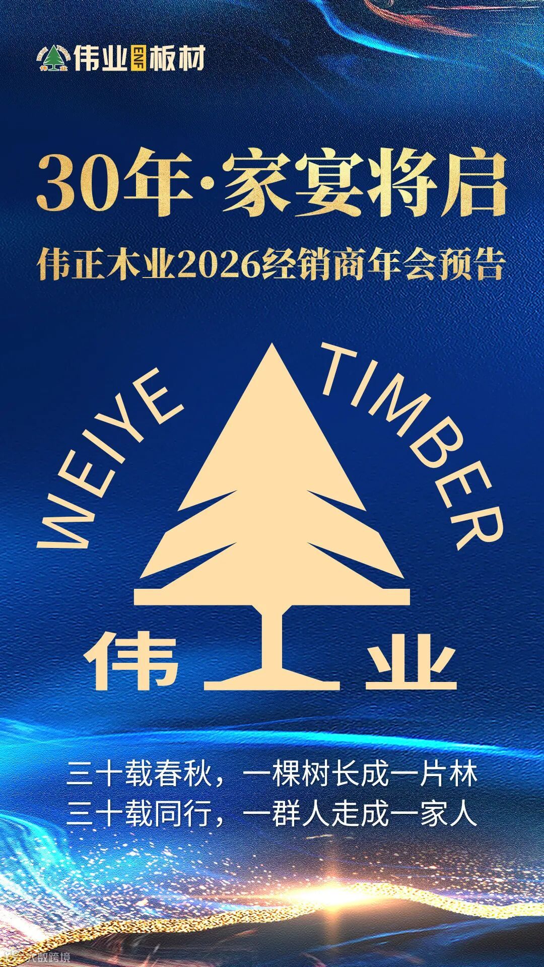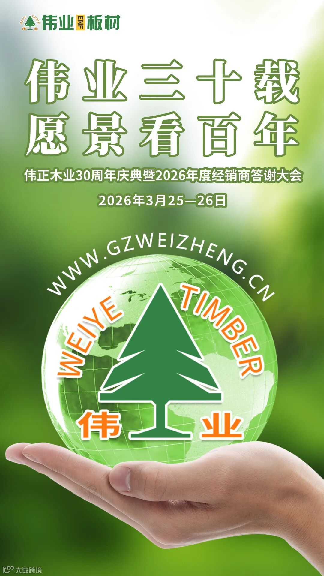 为感恩每一位并肩作战的家人,我们诚挚邀请您于2026年3月25日—26日,共赴这场春日之约——“伟业三十载,愿景看百年”伟正木业30周年庆典暨2026年度经销商答谢大会!