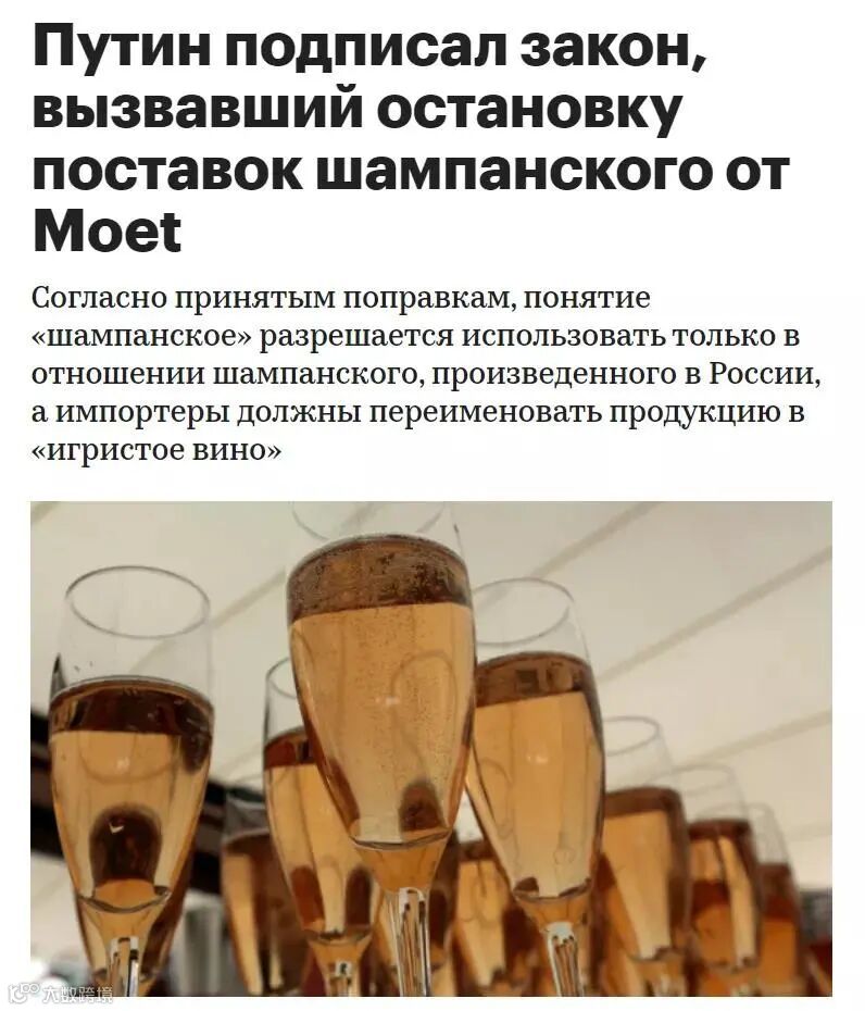最近,俄罗斯总统普京签署了一份关于香槟的最(奇)新(葩)立法,规定:法国香槟必须标注“起泡酒”的标签才能在俄罗斯出售。