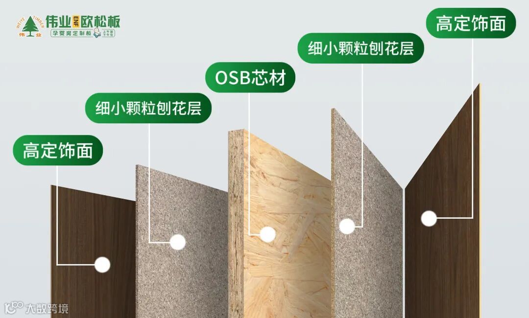 伟业ENF欧松板结构稳定,上下两层刨片呈纵向排列、芯层刨片呈横向排列,纵横交错的结构,使它具有极高的尺寸稳定性和静曲强度,加之有大量的长木纤维,线膨胀系数极小,经过连续热压成型,内结合强度极高,因此任何一处均无接头、缝隙、裂痕,整体均匀性好。