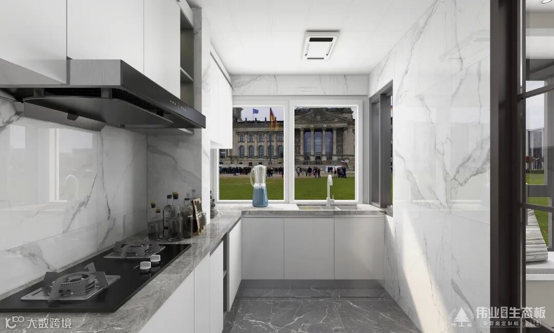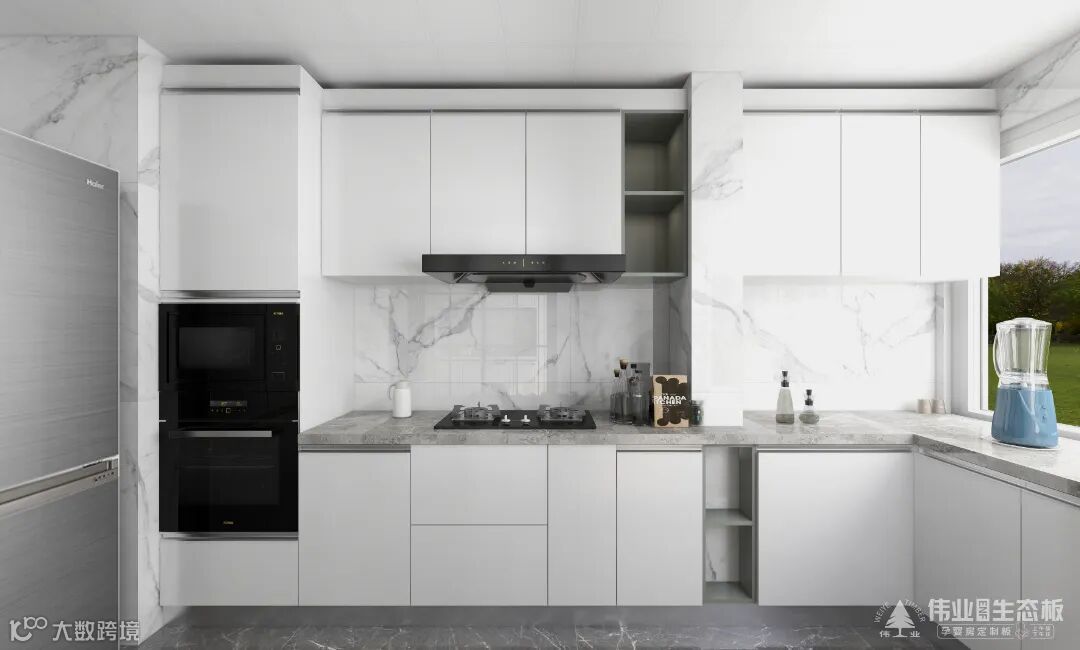 长廊型的厨房做L型布局,两面布局烹饪-洗切功能,将厨房空间充分利用。大面积的白色调,用黑+灰做点缀,色差的张力带来层次感,让小小烹饪空间实用又整洁。