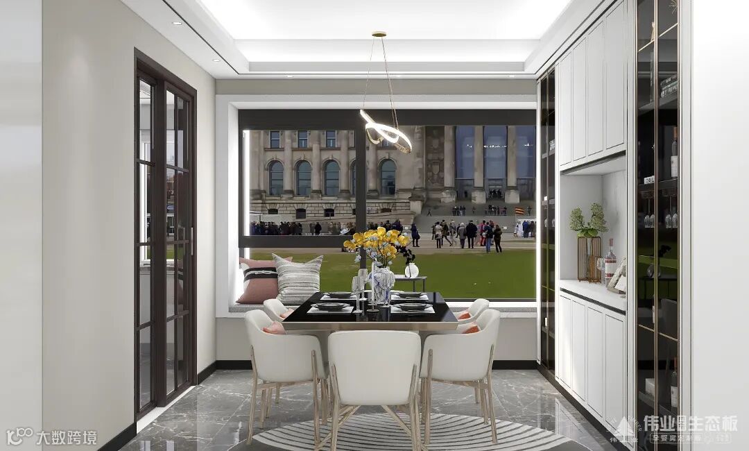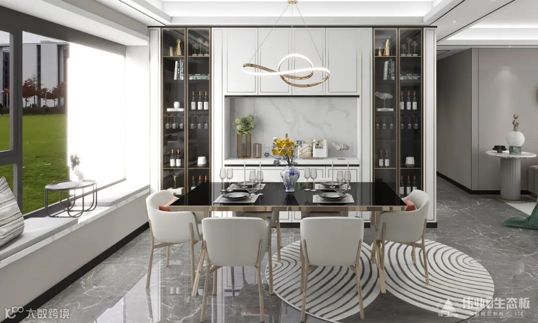 餐厅强调精简的高级感,一整面墙的餐边柜,既提供了大量收纳,又拉伸了空间视觉感,黑白分明的餐桌+餐椅,增强用餐时的仪式感,精准地拿捏住每一处细节。