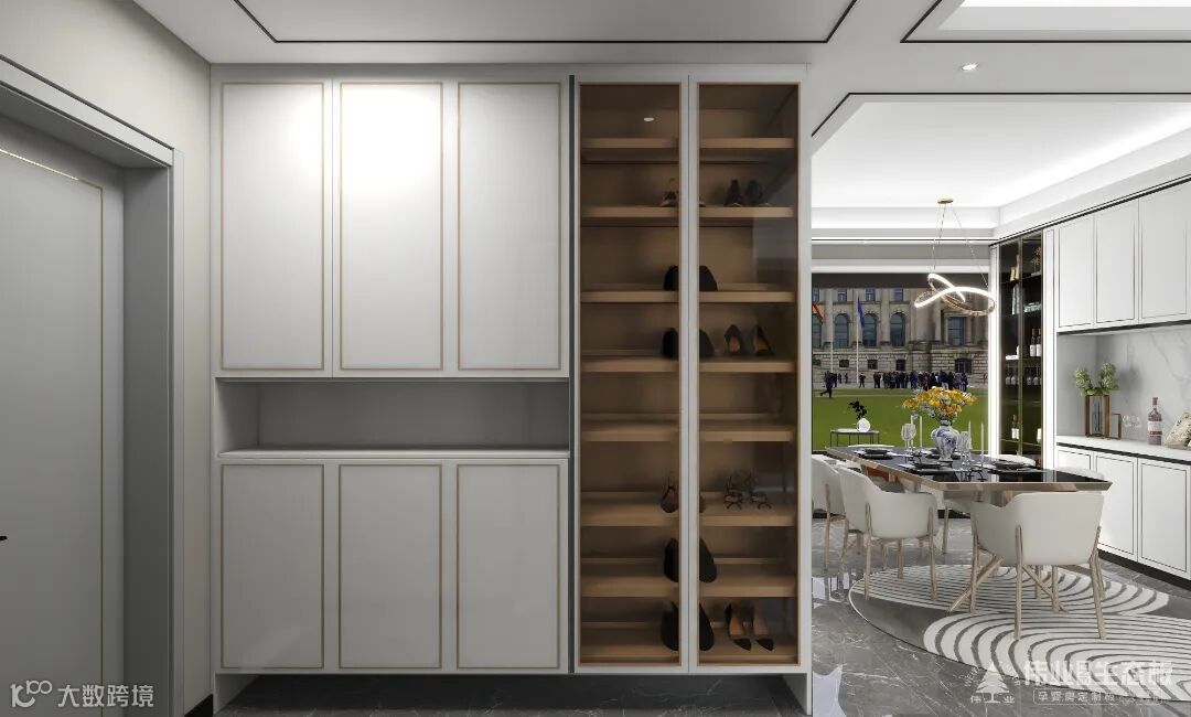 入户柜,通过线条、色彩和展示区域的平衡,达到一种宛如“艺廊”现场般的效果。白色柜门+金色描边,原木展示柜+透明玻璃,空间静谧与灵动兼具,彰显时尚的格调。