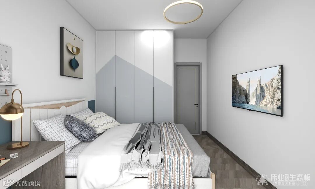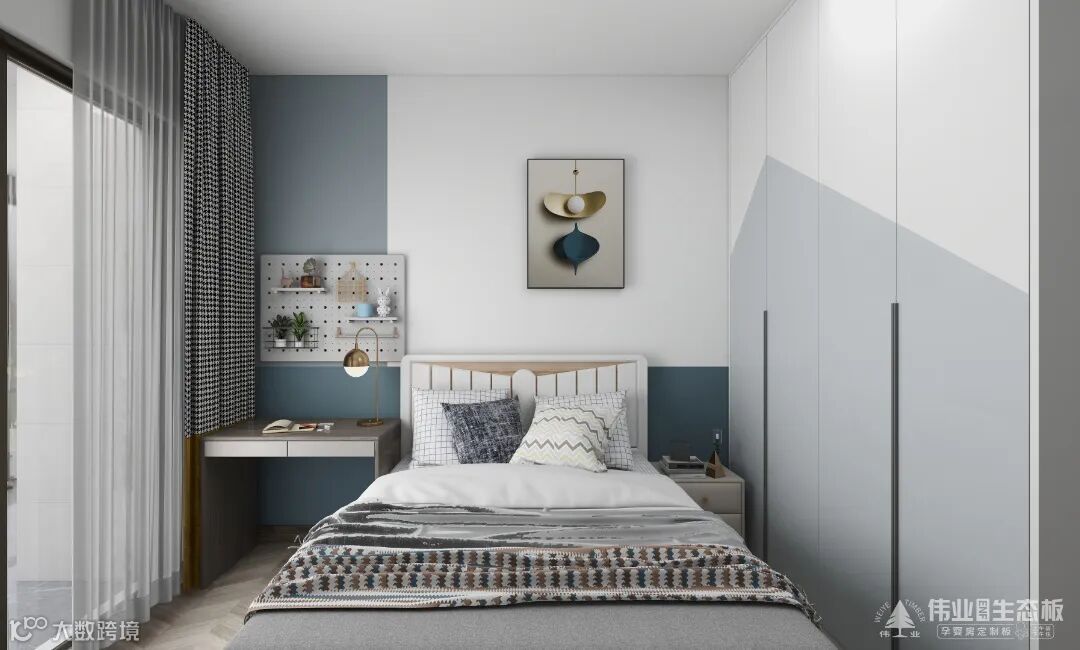 大胆地选用蓝色+白色进行色彩碰撞,采用拼色的设计手法,拼色的衣柜、床头墙,带来跳跃的活力与动感,超越固有的思维态势,充分表达了率性自由。