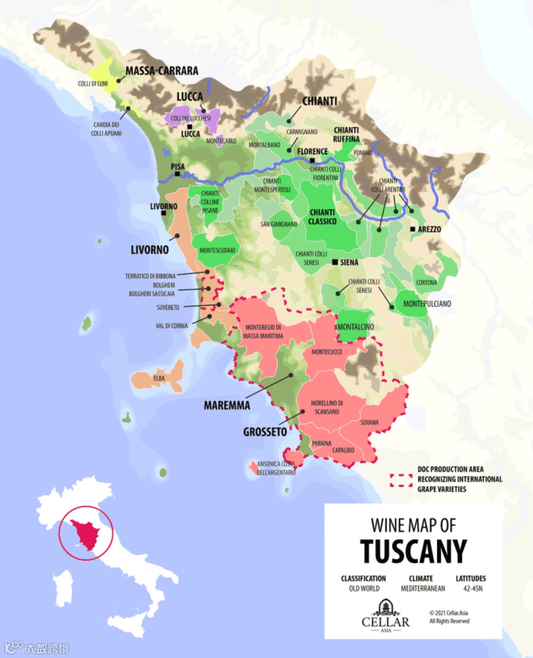 托斯卡纳产区生产多种的DOCG和DOC葡萄酒(高品质),而且其中的大多数都在国际上拥有卓越的名声。