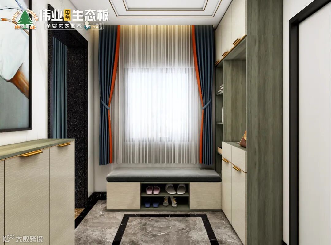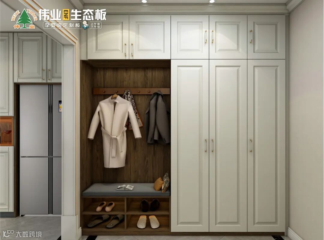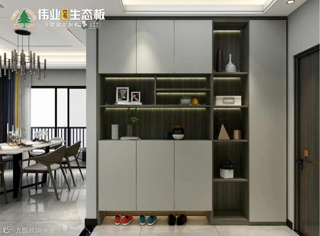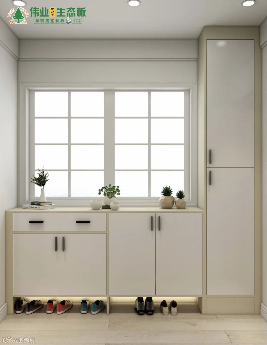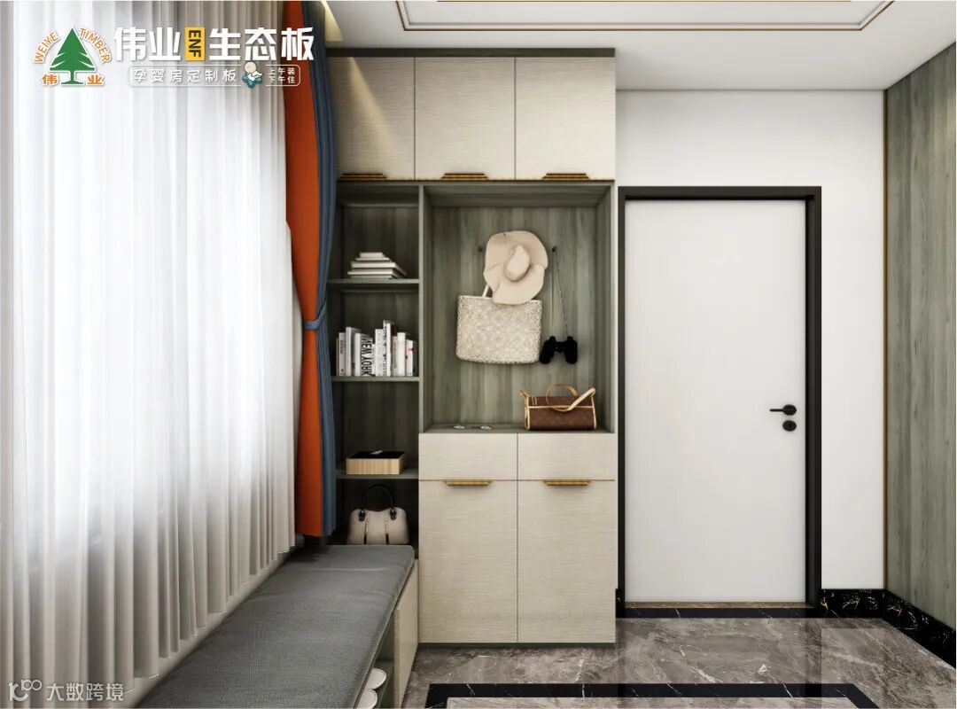 L型结构,象牙白+银丝楠木,让小小的玄关空间清新又自然,底下悬空设计方便换鞋,高低柜的收纳强大,让每一次踏进家门都充满仪式感。