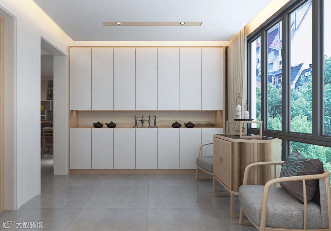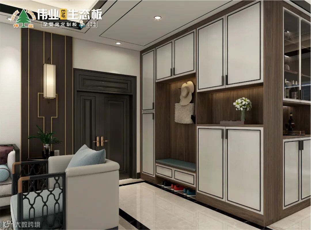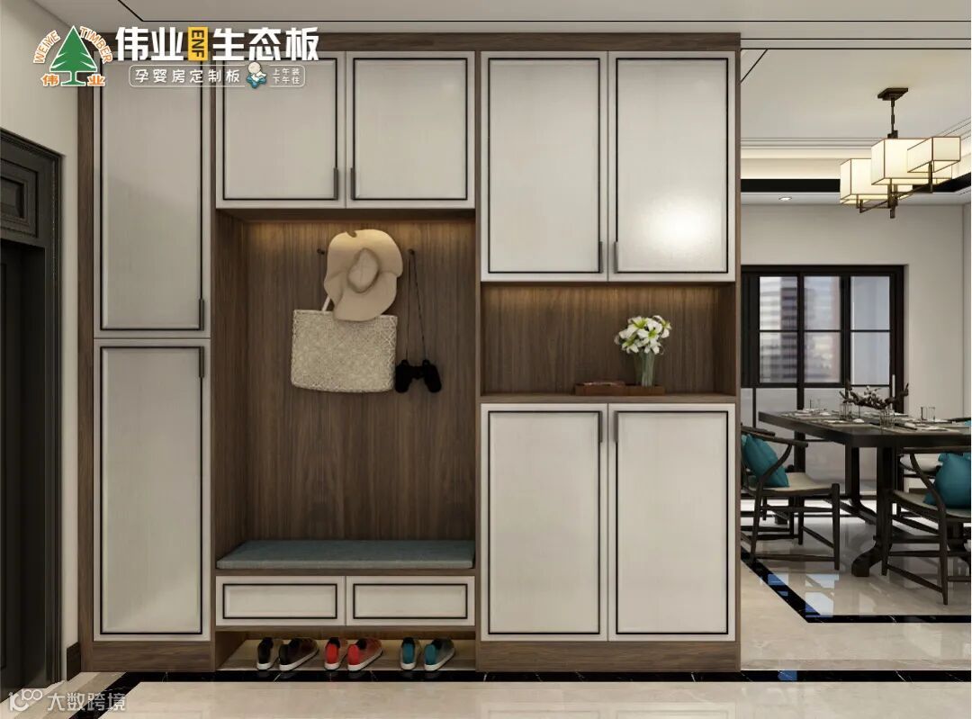 玄关柜,用一种自然、质朴、素雅的表现形式,古朴的配色,收敛起所有的喧闹与繁杂,没有繁琐多变的装饰,营造出充满新中式韵味的自然氛围。