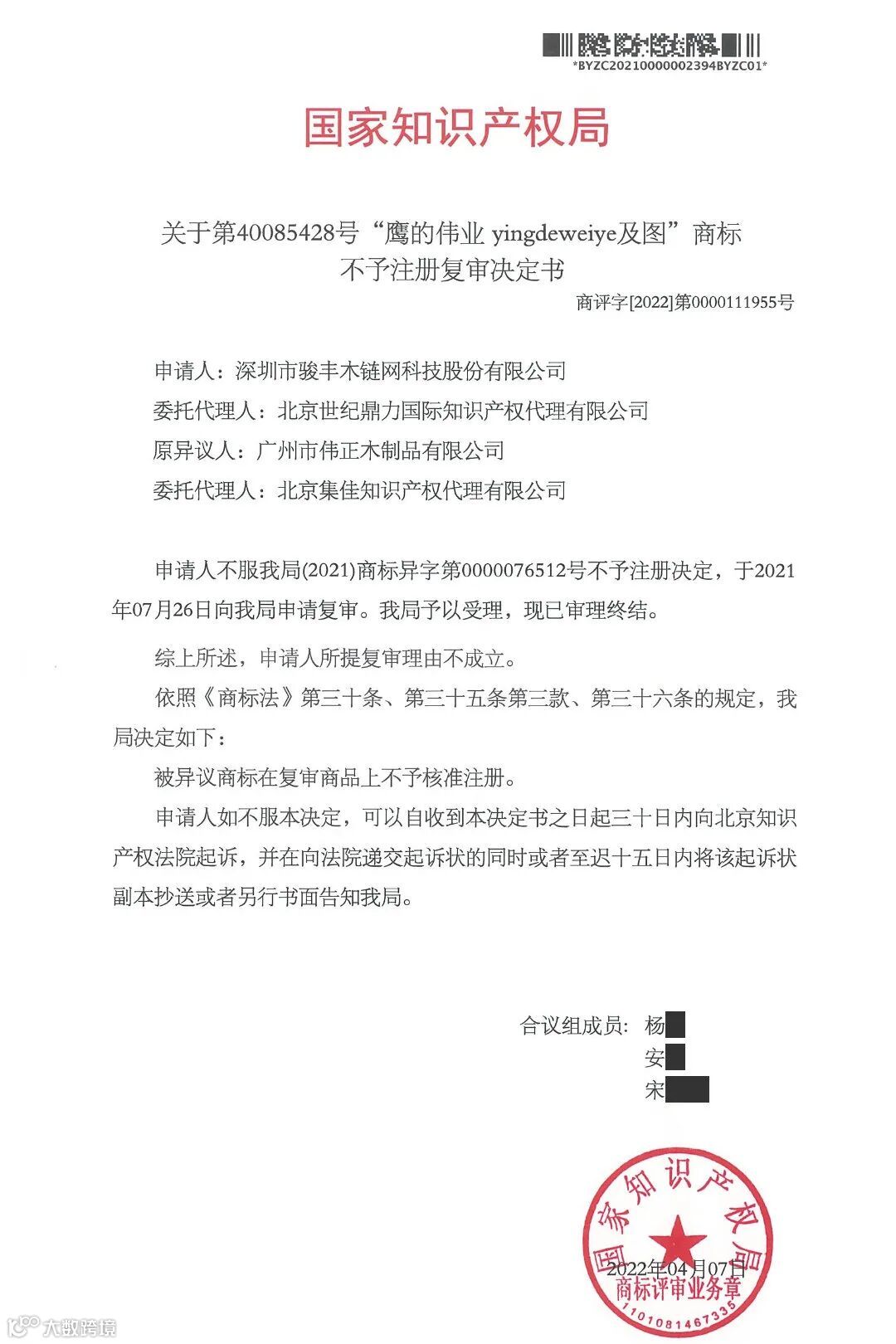 3、深圳市骏丰木链网科技股份有限公司申请注册多件与他人先实际使用且具有一定独创性或知名度的商标文字或相近的商标,部分已被我局驳回或被相关企业提出异议;