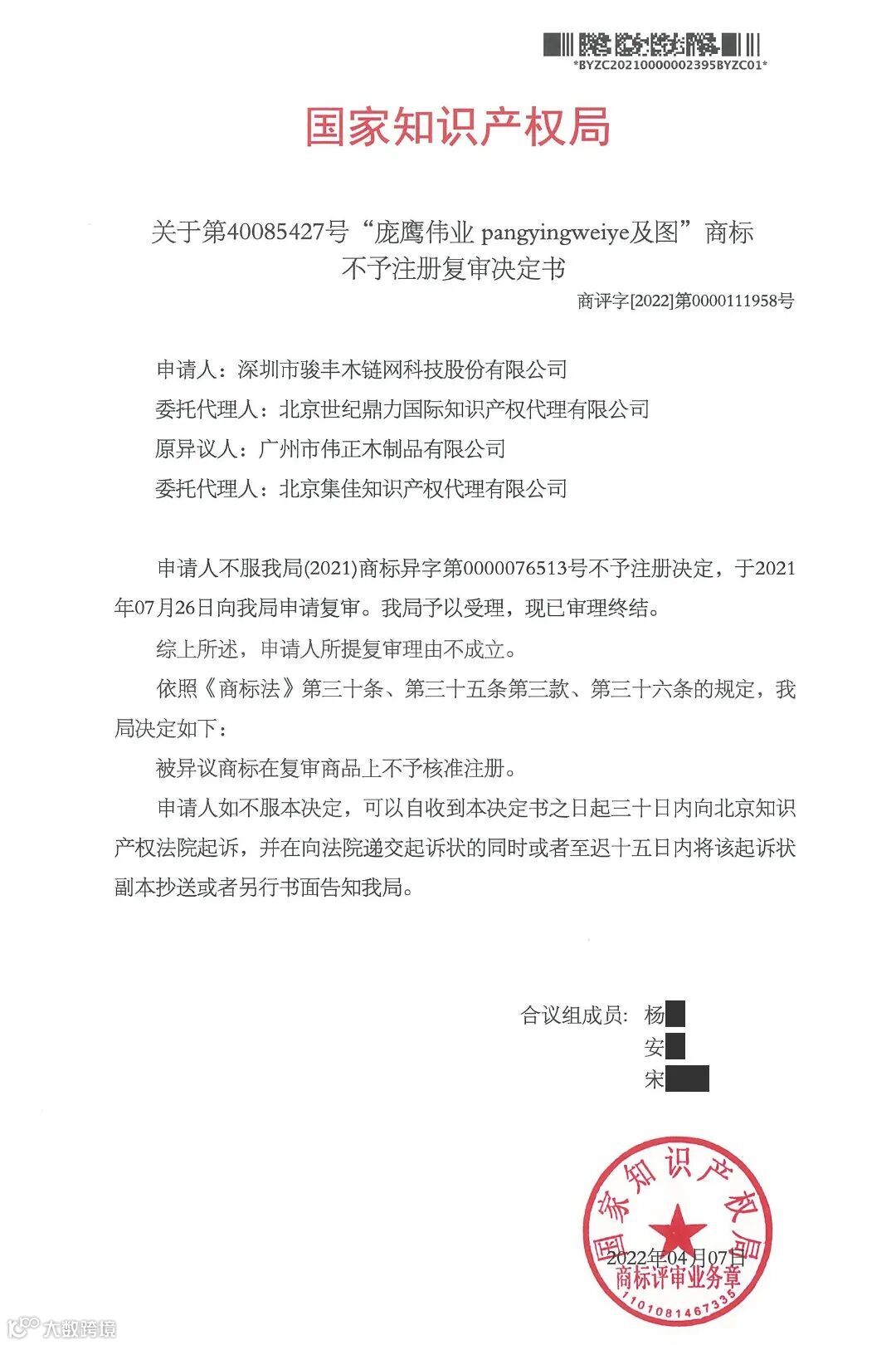 “鹰的伟业yingdeweiye及图”、“庞鹰伟业pangyingweiye及图”商标不予注册。