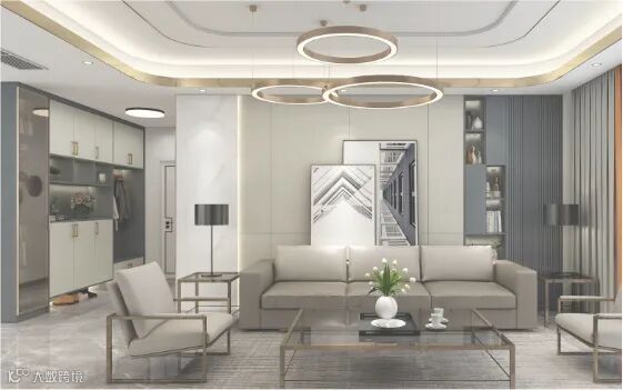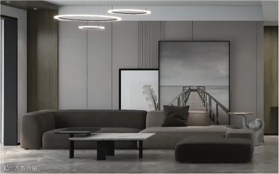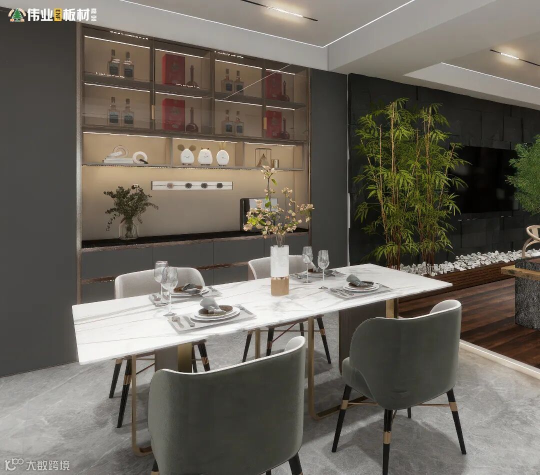 到顶餐边柜+餐桌,构成餐厅。三段式的餐边柜,不仅有强大的收纳功能,更能带来装饰的效果。暖光灯带呼应,为用餐增添仪式感。当灰色系遇上轻奢风,用质感加冕格调生活,解读生活新风向。