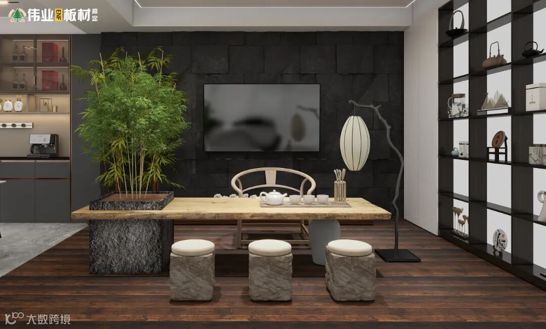 中式的茶室,融合品茗、闲谈、会客的功能。黑、白、原木三色,创造出禅意的意境,契合了国人对新国风的偏好。简单的配色、茶韵的精神,简单自然,宁静致远,既现代又不失东方气质,身处此地清朗且风雅!