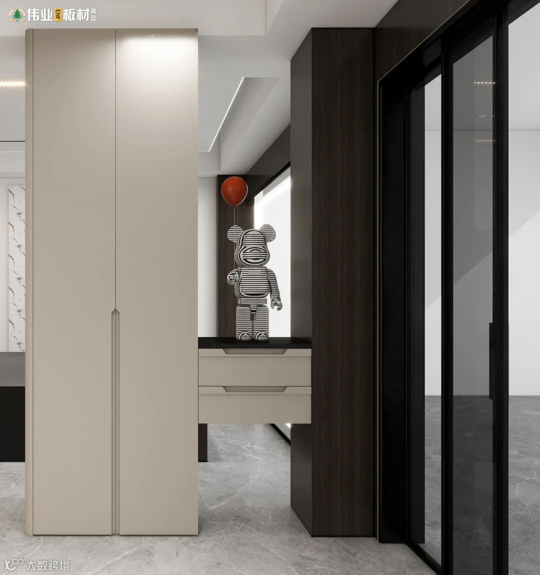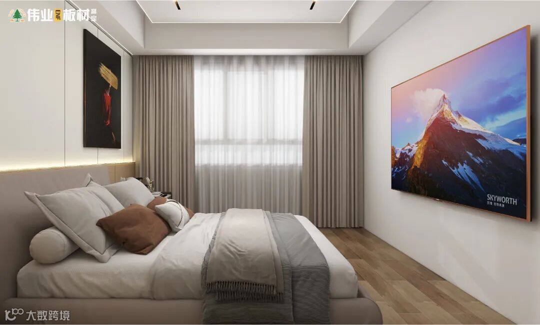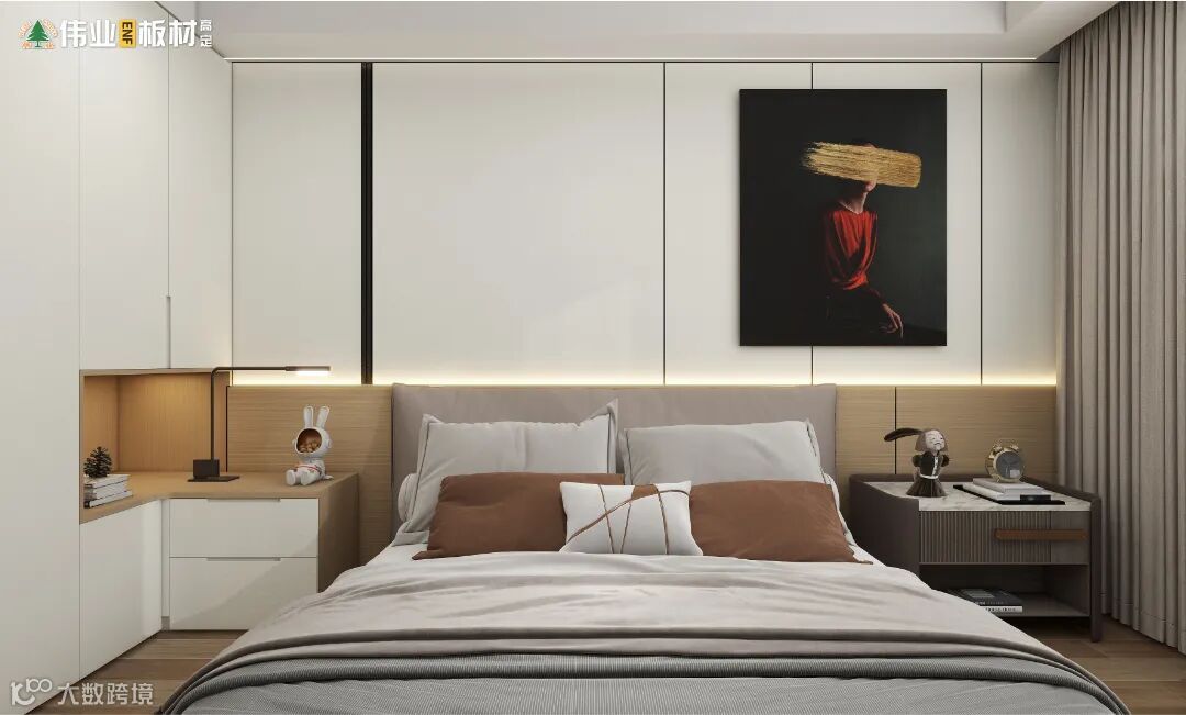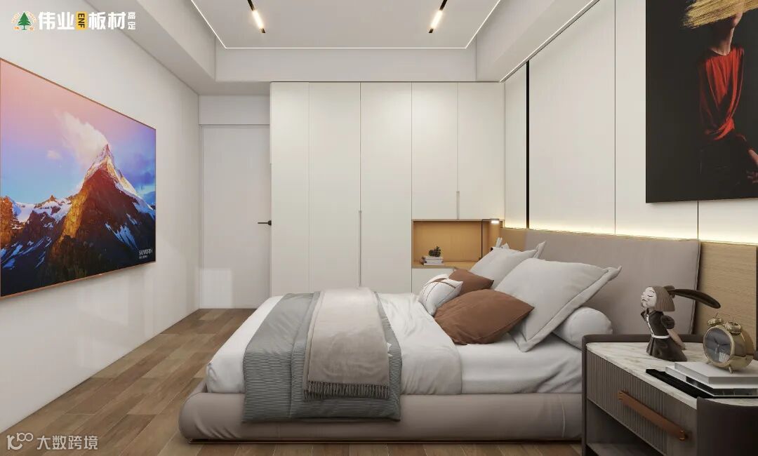 卧室遵循的是“少即是多”的理念,选择了色彩柔和的原木风,注重睡眠的舒适度,一门到顶的造型、白色的柜门、无拉手的设计,视觉上也更加轻简时尚,更加符合现代人追求时尚和无负担的生活态度。