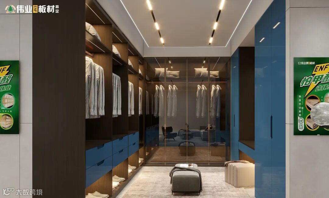 步入式U型衣帽间,包括叠衣区、悬挂区、置物区和梳妆区等,充分满足居住者日常对置物换衣的需求。精简的线条,大气的黑橡搭配时尚的湖水蓝,同时注重灯光的运用,打造出优雅大气的衣帽间。
