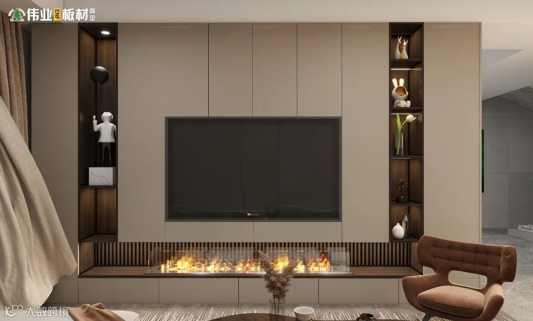 设计师赋予客厅新的定义,褪去浮夸的色彩和造型,恰到好处地展现“雅致”与“浪漫”。电视柜采用对称形式,兼具电视柜、展示两重功能。内嵌胡桃木的展示柜,突出沉稳雅致的旨趣;安装电子壁炉,为会客空间引入更多温暖的气息。