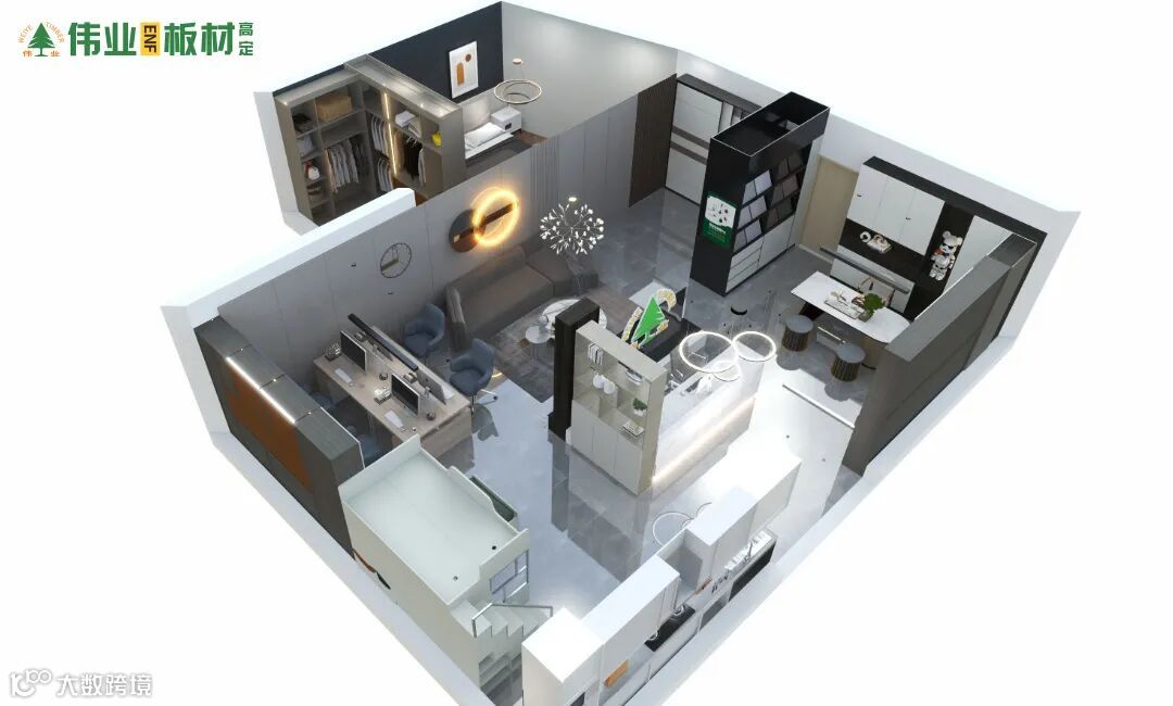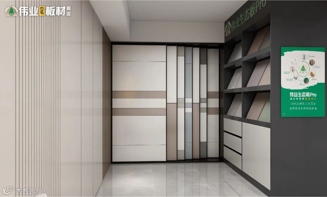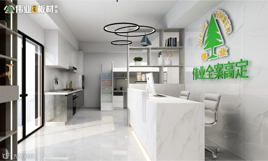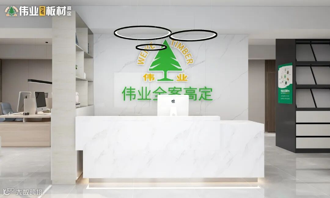 展厅入门的中央设置前台,建立“伟业全案高定”醒目标志,绿色象征着品牌的环保性,既方便参观者更容易识别、寻找,又能给参观者留下更深刻的印象。