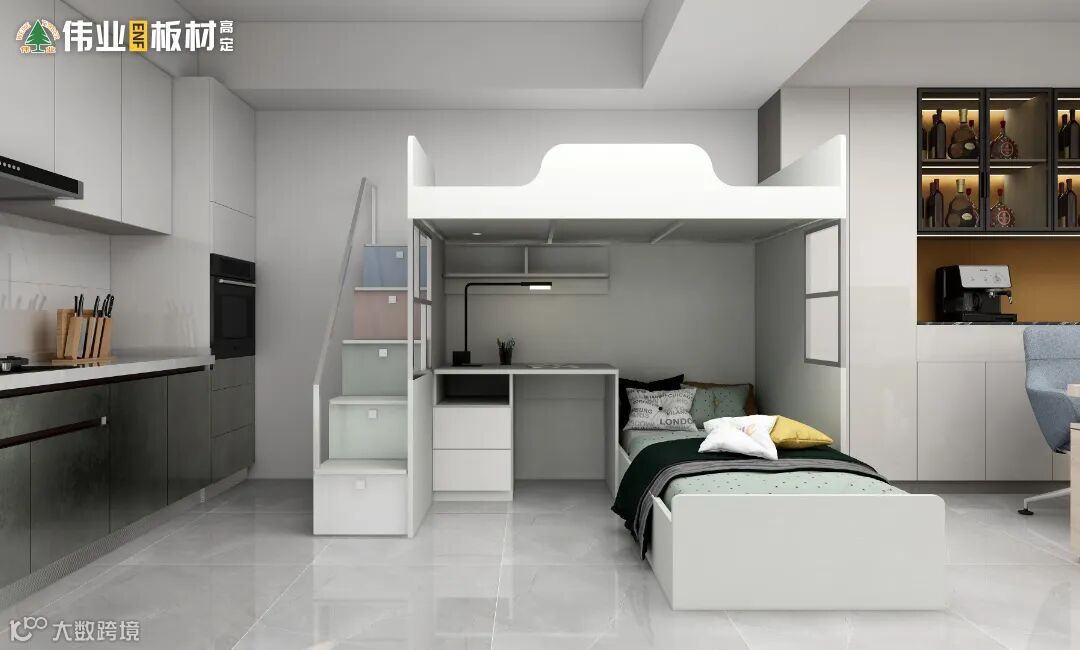 儿童房从功能出发,双层上下错位床的设计,下床腾出1㎡学习区域,简洁的外型+实用的功能,满足二胎家庭,解决睡眠、收纳、学习、互动等需求,让小儿童房实现最优设计。