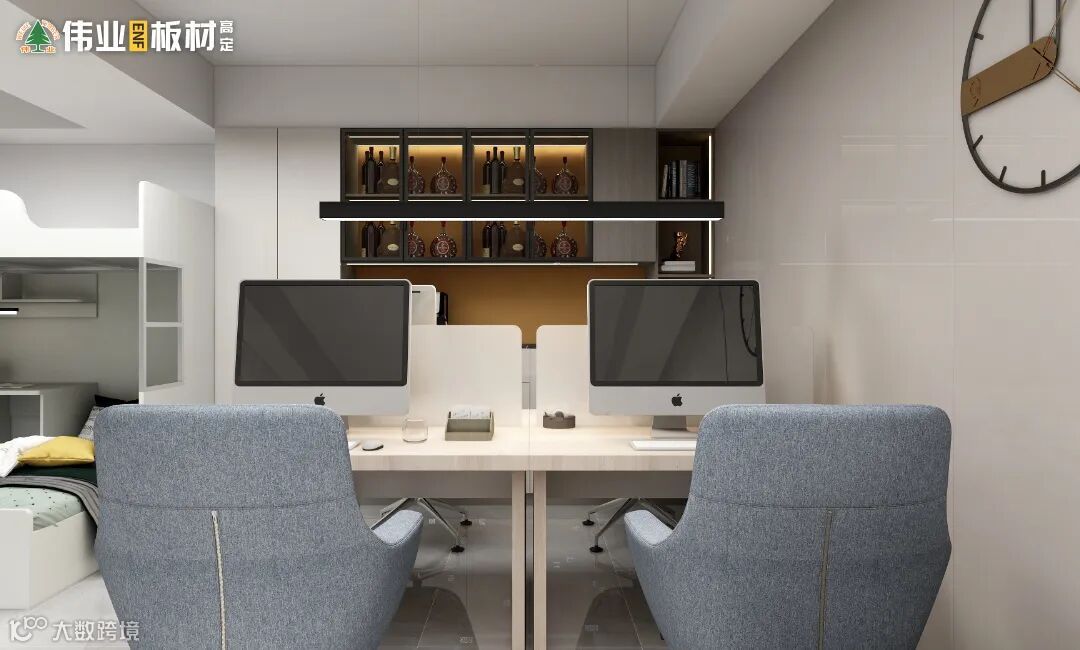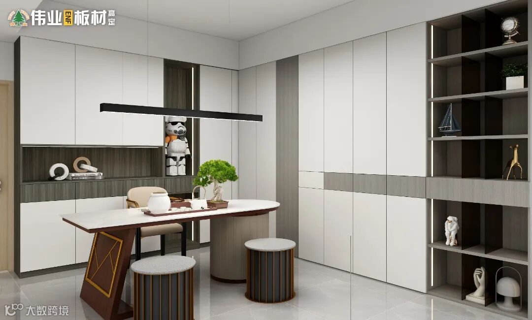 洽谈区精心设计成现代风的茶室,同时做L型收纳柜,让产品在有限的空间,实现做最大化的展示,目的在于在谈单时,更加方便意向客户了解样柜的工艺、材质。