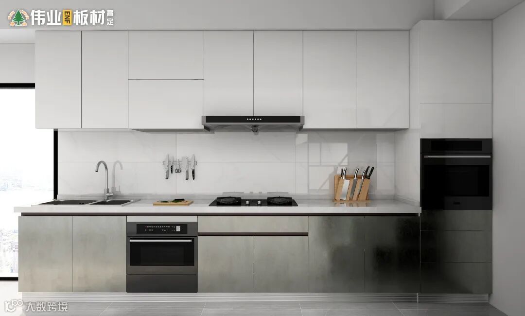 橱柜是厨房的灵魂,一字型布局,动线合理,布局简单明了,装上一个吊柜,收纳功能大大增加,满足日常使用需求。整体采用灰+白经典搭配,将空间营造得极富层次感和轻奢感。