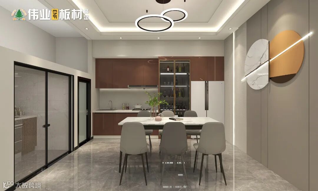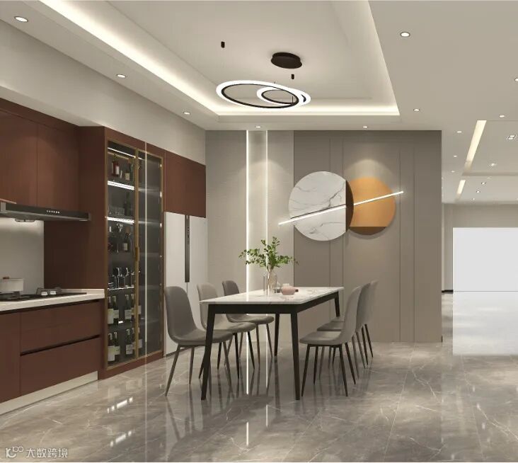 橱柜和餐桌呈双一字型,没有空间阻隔,简练高效,让厨房和餐厅实现功能互补,利用率更高。胭脂红和纯白的搭配,强烈的色彩反差,让橱柜更加鲜明大气。