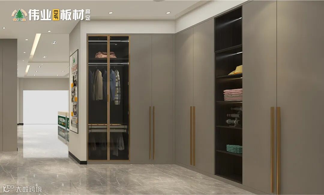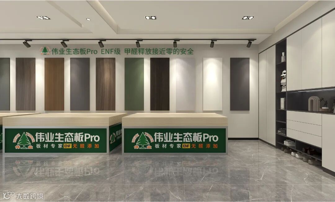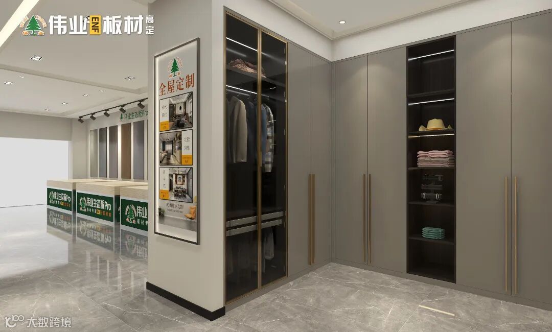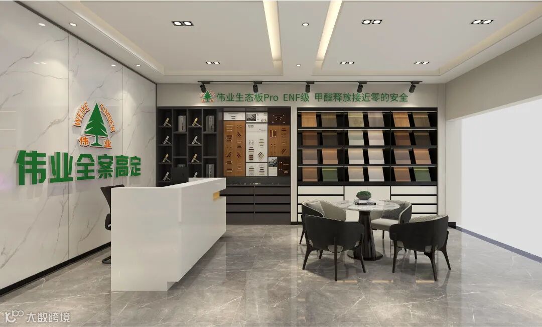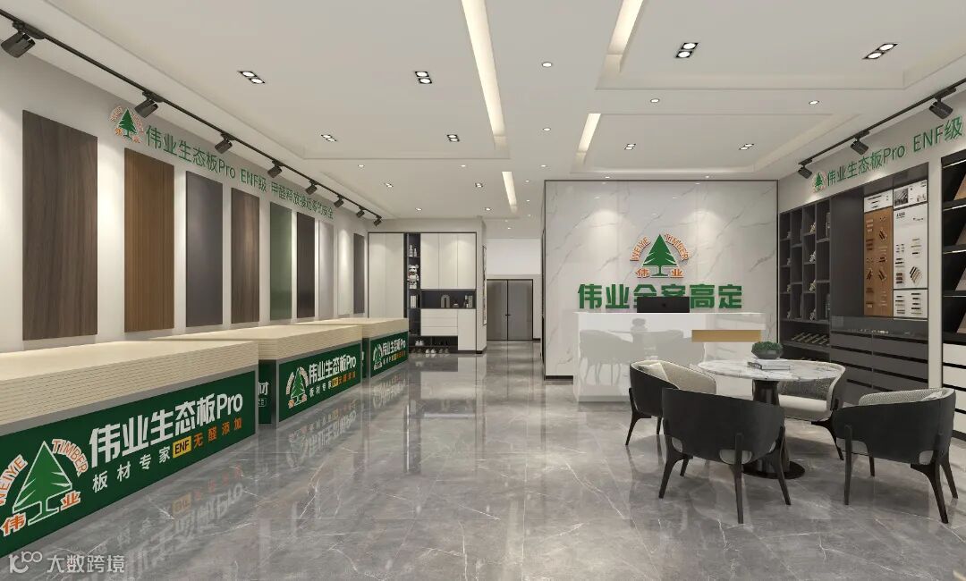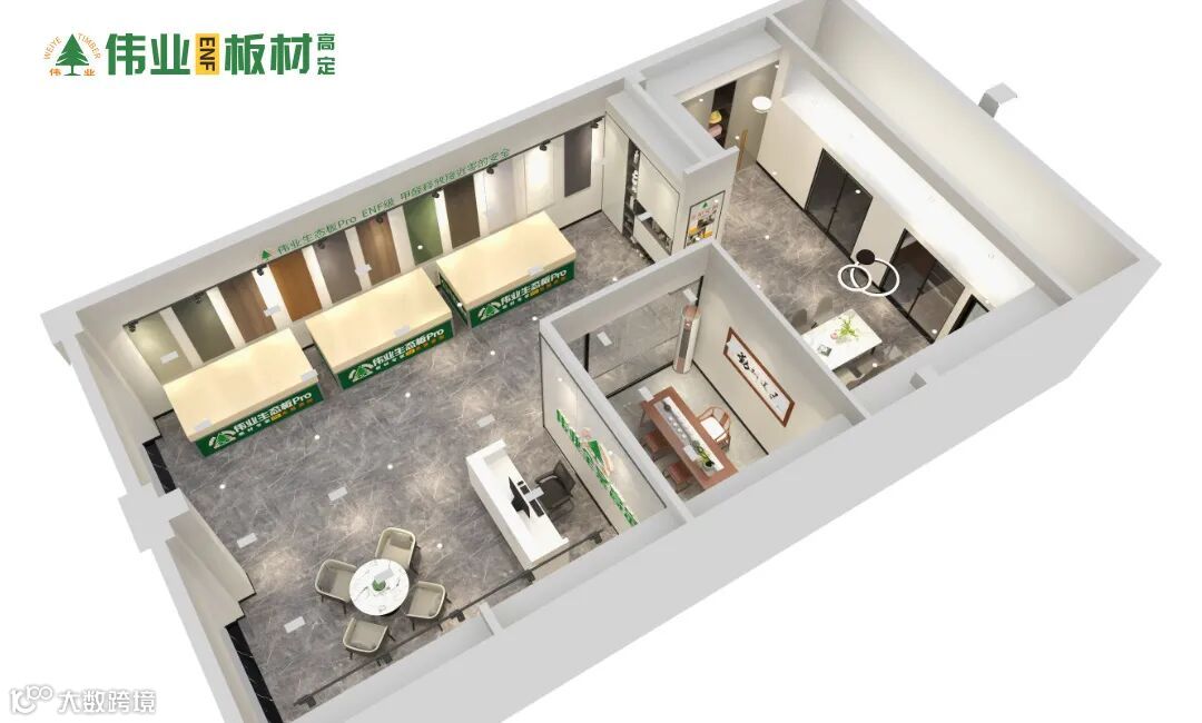 长型展厅,空间纵深较长,划分洽谈区、前台、板材展示区、定制区等区域,设计S型动线走向,通过展厅节点布局,增强消费者的情景空间体验。