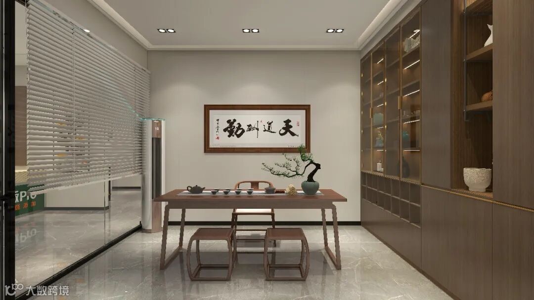 收纳柜、一套桌椅、一副挂画,组成新中式的茶室。古典的色彩,流畅的线条,素雅洒脱的韵味,让沏茶更有氛围感。可一人一茶,独享清幽,亦可三两好友,品聊人生。