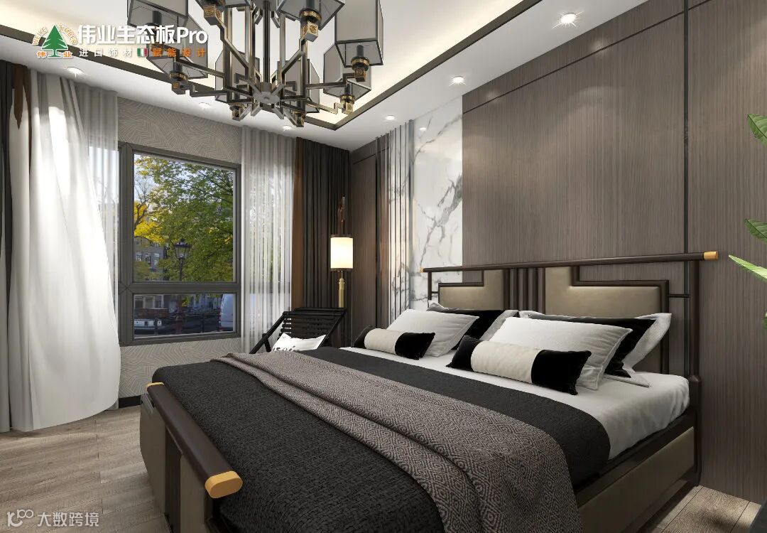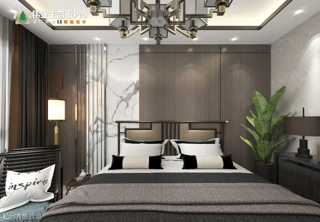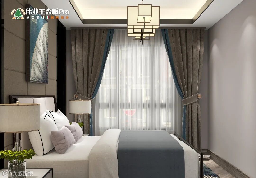 设计上萃取中式台灯、吊灯,作为空间的美学符号,再结合轻奢的理念,床头墙引入金属线框,大胆凹出时髦感。