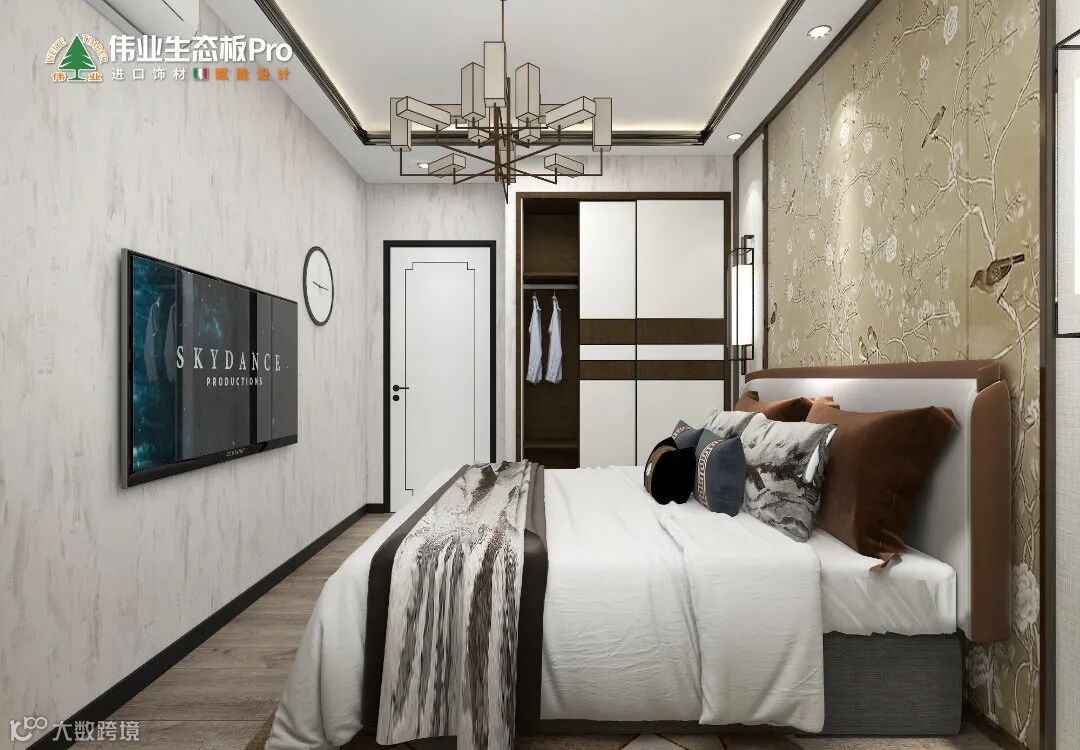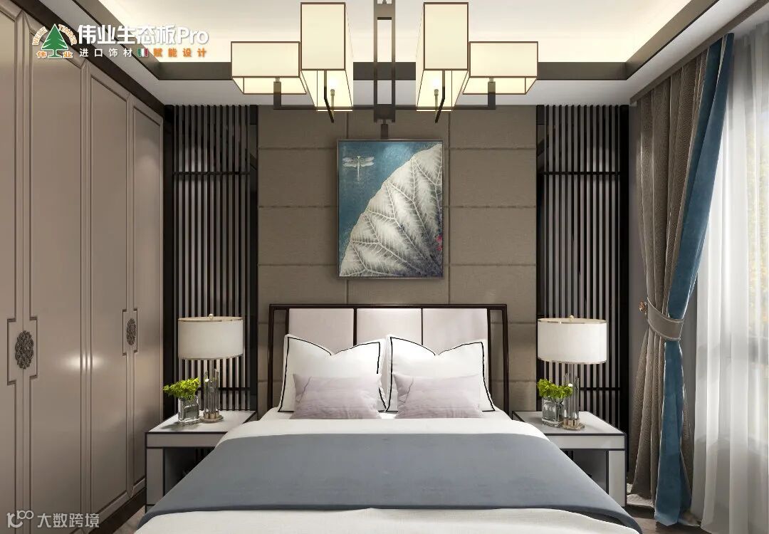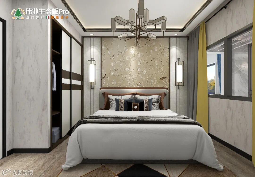 中式床头墙,气场全开,通顶衣柜,收纳值拉满,柜门腰线设计,增加美感,电视机上墙,动线更流畅。