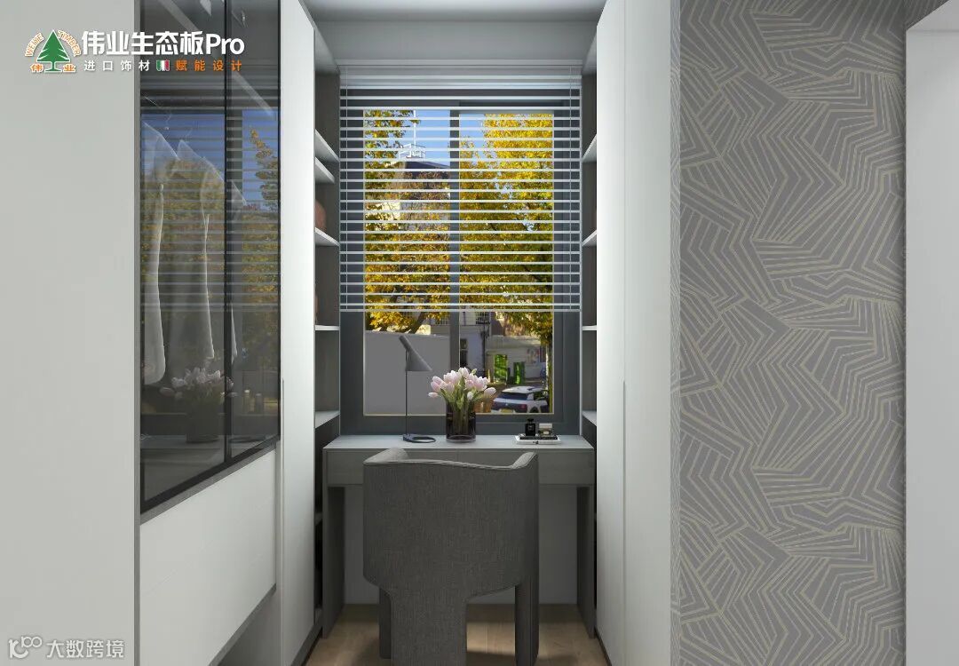 衣帽间去除繁缛,平行衣柜扛起收纳重任,增加玻璃柜门、开放层板设计,减少小空间逼仄感,窗口定制一字化妆桌,满足日常妆容需求。